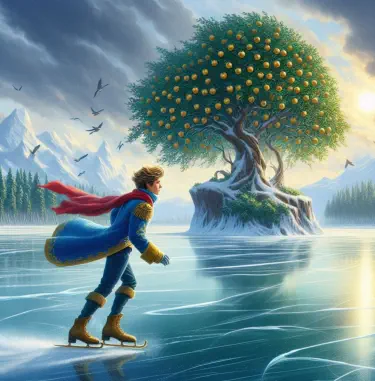 apple roll past him and set off in pursuit. On his skates, he could go faster than the golden apple could roll, and he picked it up from the ice. With the golden apple in his